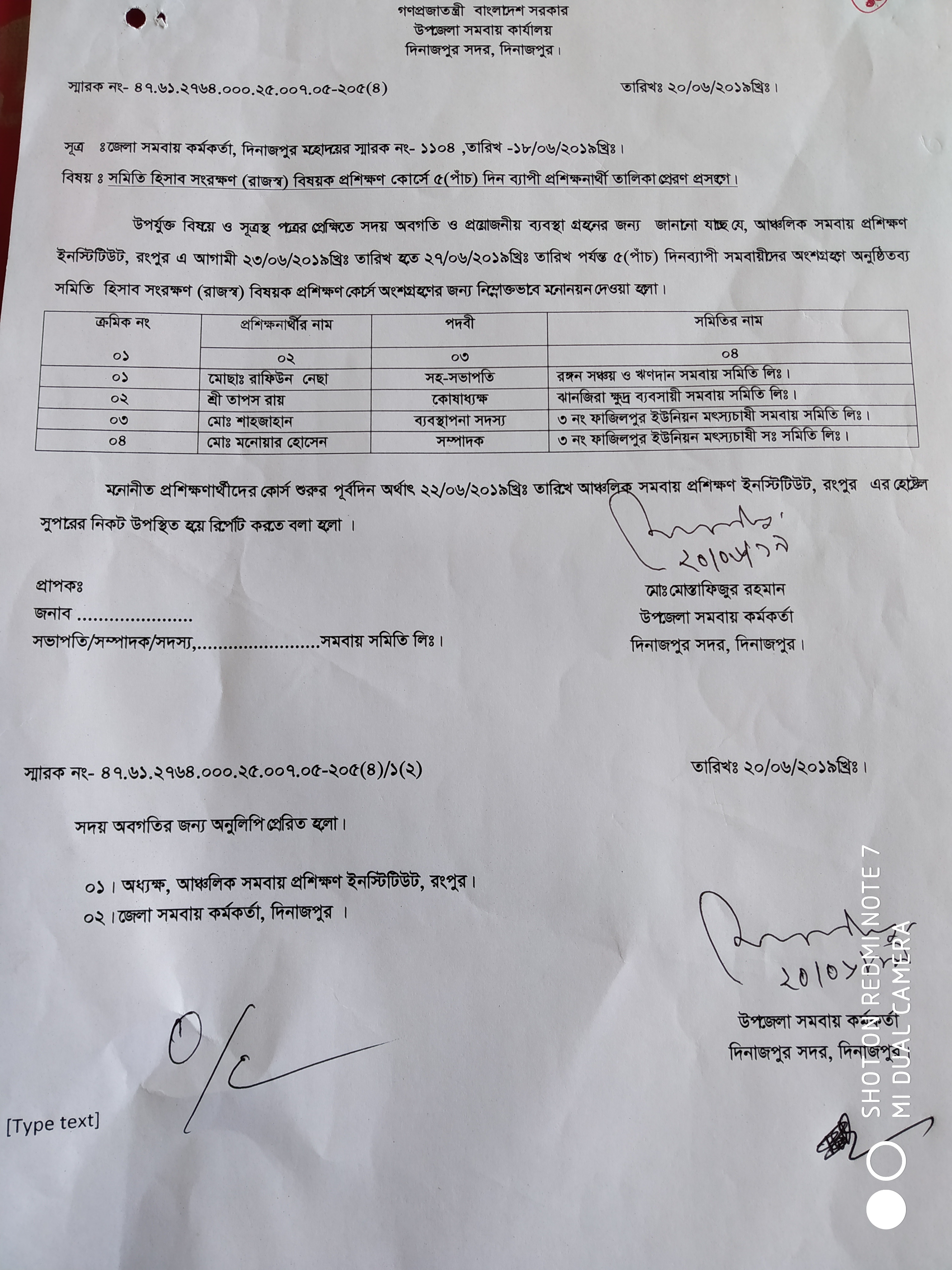 আঞ্চলিক সমবায় প্রশিক্ষণ ইনস্টিটিউট, রংপুর এ ২৩/০৬/২০১৯খ্রিঃ হতে ২৭/০৬/২০১৯খ্রিঃ পর্যন্ত সমিতি হিসাব সংরক্ষণ (রাজস্ব) বিষয়ক কোর্সে প্রশিক্ষণার্থী প্রেরণ।